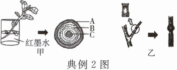 (1)将新鲜带叶枝条插入稀释后的红墨水,置于温暖、光照充足的环境中,10min后取出,横切枝条的中上部,放大观察,如图甲所示。横切面变红的部位是