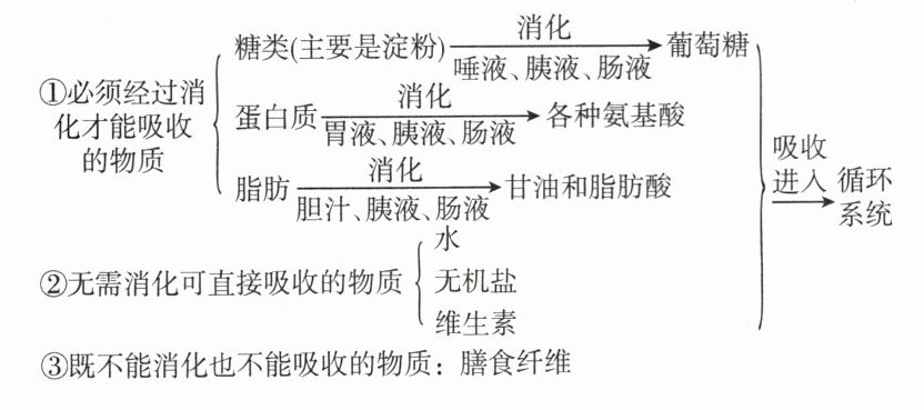 ②无需消化可直接吸收的物质:水、无机盐、维生素