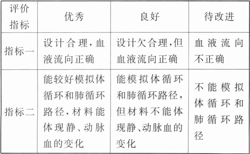 (4)针对该模型设计了如表所示的评价量表(节选)。该模型设计合理,血液流向正确,因此“指标一”被评为优秀;你认为“指标二”应被评为