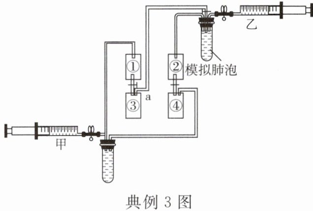 (选填“打开”或“关闭”)状态。(3)若红色溶液模拟动脉血,蓝色溶液模拟静脉血,将甲、乙注射器里的溶液适量注入试管后,均能显示相应颜色。则甲注射器里应装