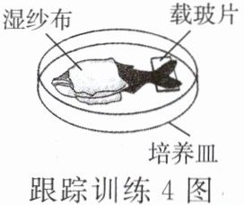 [2024·绍兴模拟]在“观察小鱼尾鳍内的血液流动”实验中,用湿纱布包裹小金鱼的鱼头和鱼身,只露出鱼尾,放在培养皿上,用载玻片盖住鱼尾,如图所示。下列说法正确的是(
