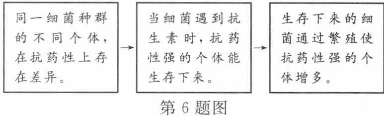 6. [2024·山海联盟模拟]滥用抗生素易导致某些细菌抗药性增强,对人类的健康造成潜在威胁。某同学利用达尔文进化论的观点,对细菌抗药性增强原因的解释如图所示: