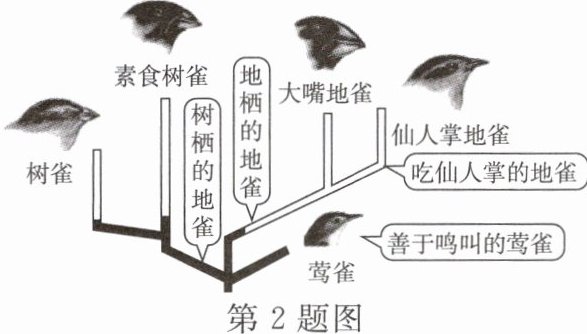 2. [2024·湖州二模]加拉帕戈斯群岛的不同小岛上生活着喙型不同的地雀,其进化过程如图所示。下列陈述不符合达尔文进化论的是(