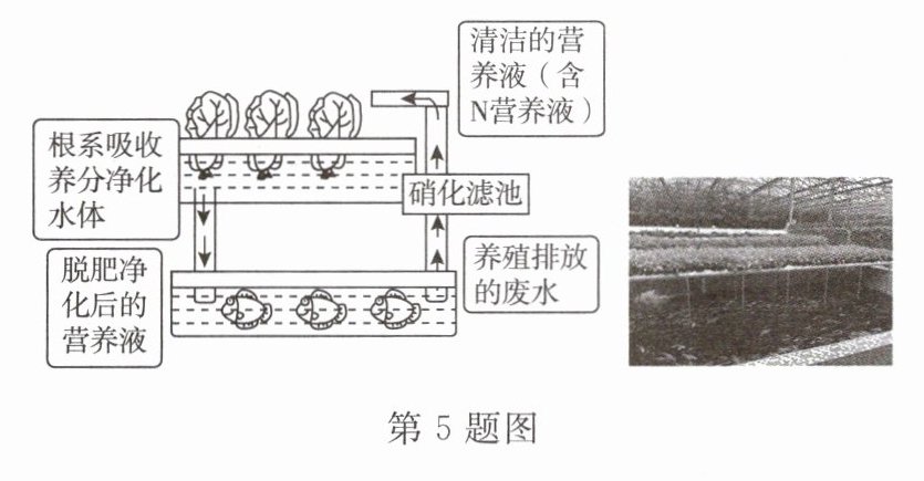 5. [2025·金华一模]“鱼—菜共生”是一种新型生态农业模式,其运行原理为①鱼类排泄物和残饵被硝化滤池内的微生物(硝化细菌)分解为含氮、磷等的无机盐;②蔬菜根系吸收水中养分,净化水体;③净化后的水循环回鱼池重复利用。该系统实现了“养鱼不换水,种菜不施肥”的可持续循环,模式图如图所示。
