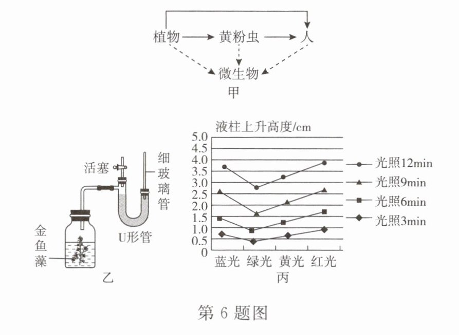 (3)“月宫一号”里的植物能为人提供氧气、水和食物。光照是影响植物光合作用强度的因素之一。某科学兴趣小组利用图乙装置研究不同色光对金鱼藻光合作用的影响,并对实验中测得的数据进行处理(如图丙所示)。据图分析,“月宫一号”内给植物照射的最佳两种色光为