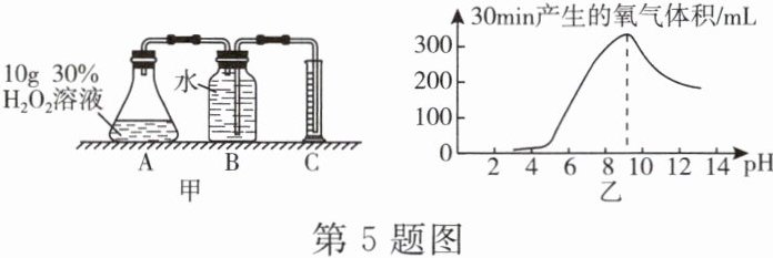 5. 过氧化氢溶液保存时,因缓慢分解导致质量分数变小。为探究酸碱性对过氧化氢分解快慢的影响,小明利用如图甲所示装置,每次实验往锥形瓶中加10g浓度为30%的过氧化氢溶液,再滴加调节剂,使其pH分别从3依次调至13,在60℃反应温度下进行实验,获得数据如图乙所示。