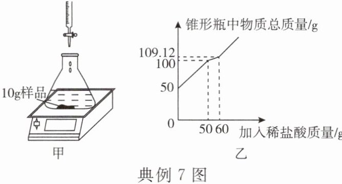 [2025·山东烟台]化学小组同学在实践基地发现一袋久置的熟石灰,标签显示其含少量杂质(杂质不溶于水也不与酸反应)。同学们为探究其变质程度,进行以下实验。取该熟石灰样品10g于锥形瓶中,加入40g水,振荡,然后逐滴加入一定溶质质量分数的稀盐酸,边加边振荡,如图甲所示。加入稀盐酸的质量与锥形瓶中物质的总质量关系如图乙所示。(忽略在水中的溶解)