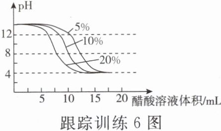 [2025·慈溪校级模拟改编]染布前可以用盐酸洗去布料表面部分碱性物质(如KOH),染色后的织物呈碱性,可用醋酸溶液调节pH至合适范围,如图所示为5%、10%、20%的醋酸溶液与等浓度等质量的KOH溶液反应的pH变化图。下列选项正确的是(