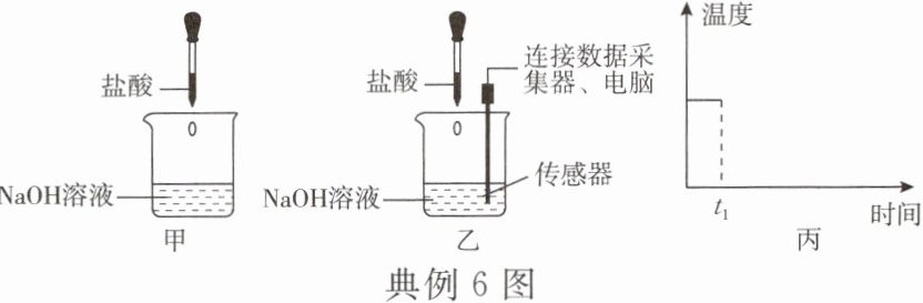 。(3)盐酸和NaOH反应会放出热量。保持环境温度不变,在NaOH溶液中插入温度传感器,记录温度数据至t₁时,迅速将等质量、等温度的盐酸倒入其中。在图丙中画出后续的温度随时间变化示意曲线(绘至温度稳定为止)。