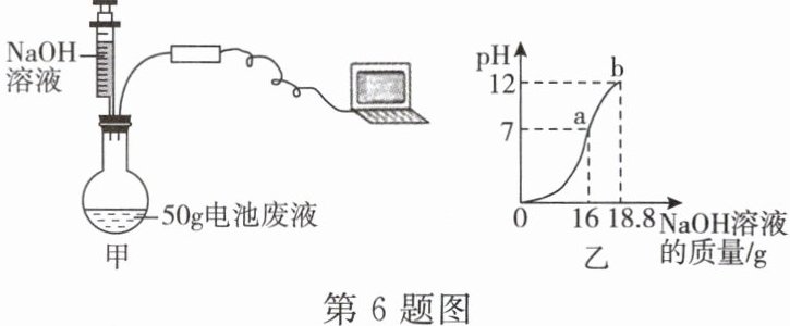6. [2024·杭州淳安县模拟]科学小组参加“铅蓄废电池中硫酸回收”的研学项目,回收时需要测定电池废液中硫酸的质量分数。向装有50g废液的圆底烧瓶中加入质量分数为10%的氢氧化钠溶液,并充分搅拌,利用pH计等电子设备采集信息并绘制成如图乙所示图像,请据图回答下列问题。