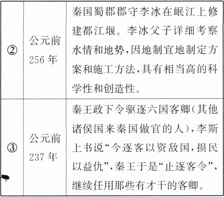 (2)示例一:选择①和③。公元前356年,秦孝公任用商鞅主持变法,变法使秦国的政治、经济、文化、社会生活面貌有了根本的改变,综合国力大为增强,提高了军队战斗力,一跃而成为最强盛的诸侯国,为以后秦统一中国奠定了基础。公元前237年,秦王“止逐客令”,使秦国能够广纳贤士,吸收人才,增强了秦国的行政和军事能力,加速了统一的进程,为秦统一中国提供了人才保障。 示例二:选择①和②。商鞅变法增强了秦国的综合国力,提高了军队战斗力,为秦统一中国奠定基础。都江堰的修建,发挥了防洪、灌溉、水运等综合作用,使成都平原成为沃野,进一步增强了秦国的经济实力,为秦国提供了更多的粮食和物资,为秦实现统一奠定了坚实的经济基础。