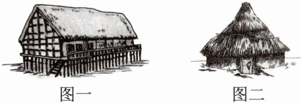 (2)图一:干栏式建筑;图二:半地穴式房屋。 原因:南方气候湿润,北方气候干燥(或气候环境、地理位置不同)。