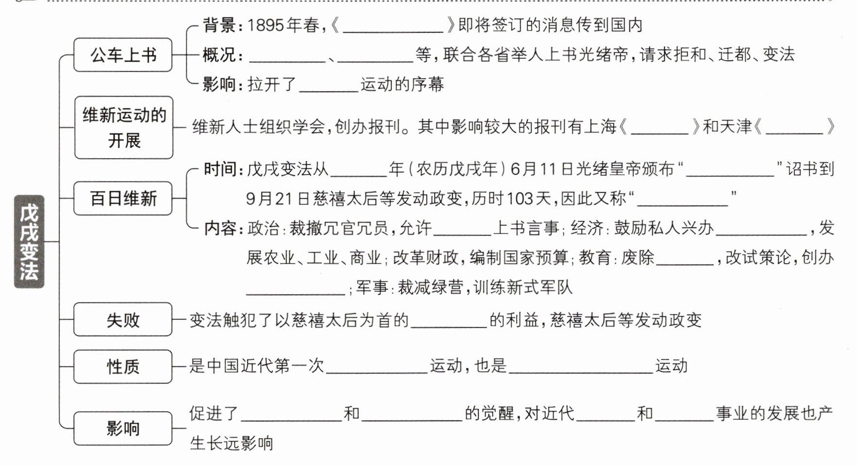 马关条约 康有为 梁启超 维新 时务报 国闻报 1898 明定国是 百日维新 士民 工矿企业 八股文 京师大学 堂 顽固派 思想解放 资产阶级改良 思想启蒙 民族意 识 教育 报刊