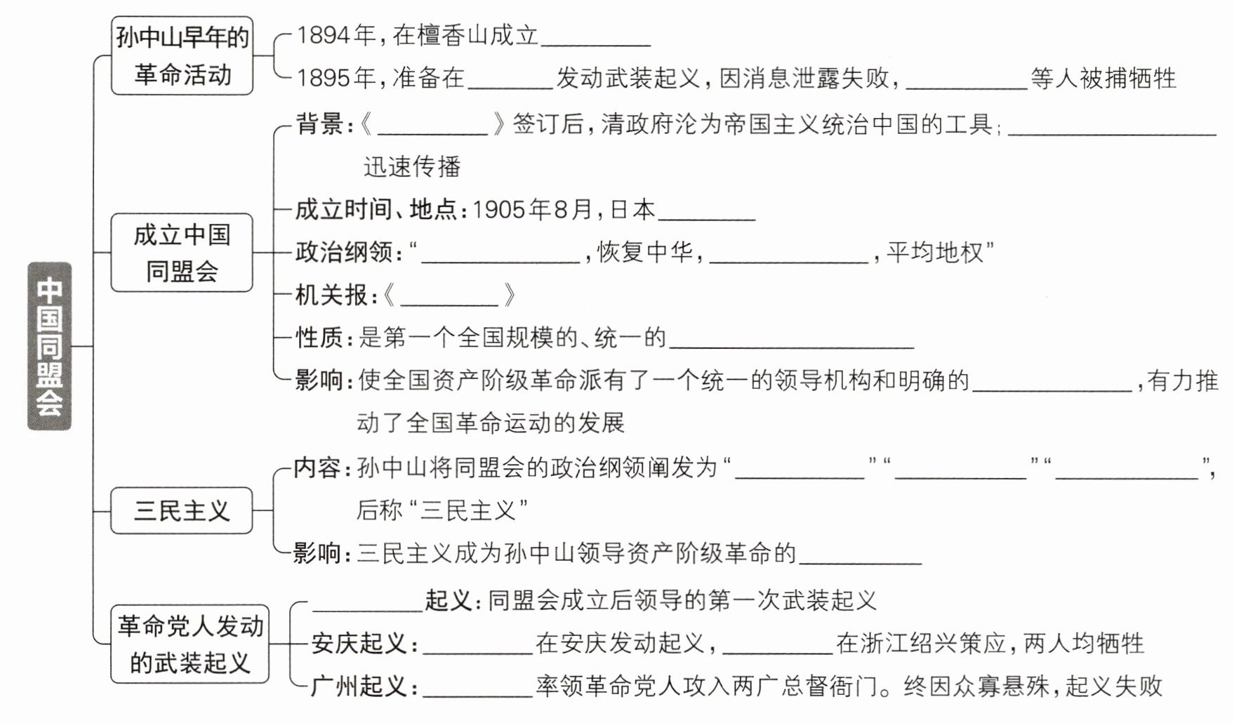 兴中会 广州 陆皓东 辛丑条约 资产阶级革命思想 东京 驱除鞑虏 创立民国 民报 资产阶级革命政党 奋斗目标 民族主义 民权主义 民生主义 指导思想 萍浏醴 徐锡麟 秋瑾 黄兴