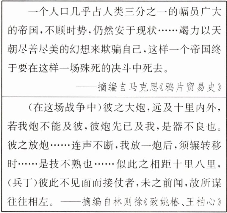 (2)材料二中两则材料分别从什么视角解释鸦片战争清政府失败的原因?为什么对鸦片战争失败原因的结论会不同?