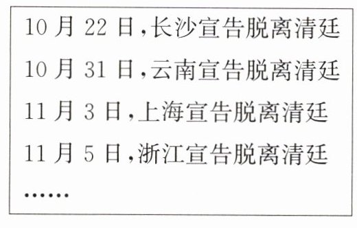 3.C 解析:从材料中的时间及地点范围可得出短时间内各省纷纷响应;根据所涉及的范围省份可得出省份多,范围广,说明清政府统治土崩瓦解,C项正确;材料中长沙、云南等地宣告脱离清廷,与列强侵略逐渐深入无关,排除A项;通商口岸日趋增多与材料信息不匹配,排除B项;民主革命并没有取得彻底胜利,辛亥革命果实被袁世凯窃取,排除D项。