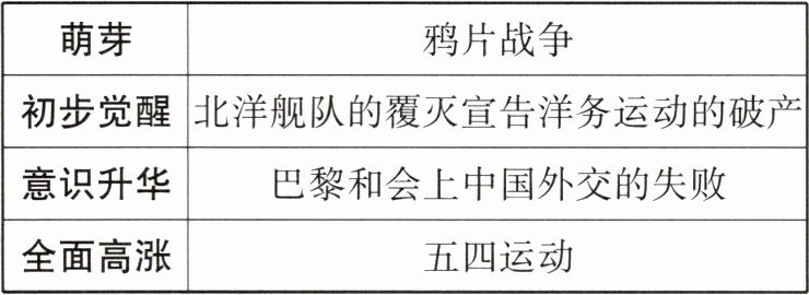 (3)鸦片战争后,地主阶级提出“师夷之长技以制夷”的口号,反抗西方侵略,民族意识开始萌芽;甲午中日战争的失败,使中华民族的民族意识初步觉醒;巴黎和会期间,中国外交代表据理力争,维护国家主权,民族意识得到升华;巴黎和会中国外交失败,国内爆发五四运动,各个阶级都参与进来,体现了民族意识的全面高涨。