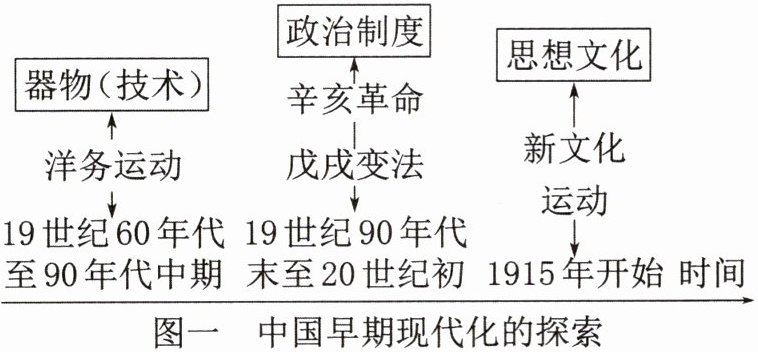 (1)任务一:解读图示。根据图一,指出中国早期现代化探索的特点,并写出新文化运动的口号及其历史进步性。