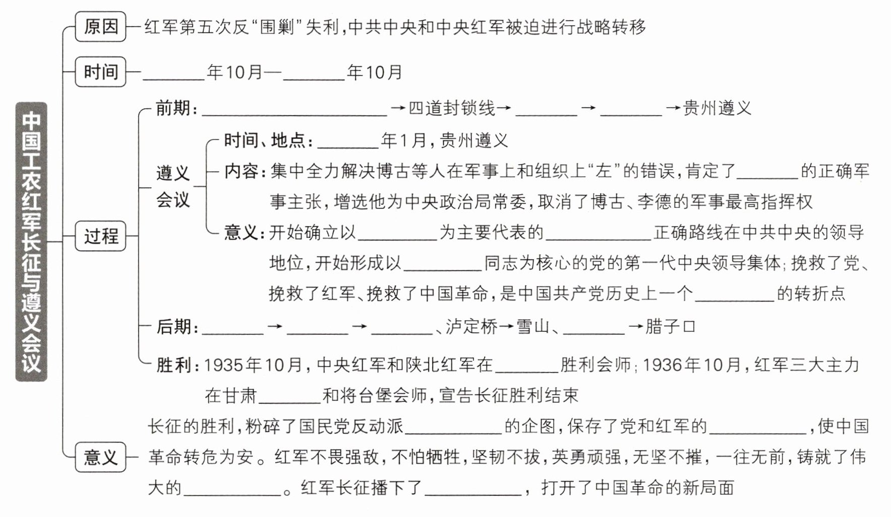 1.C 解析:根据所学和材料“特别是1934年,使我们遭到了很大的损失”可知,由于“左”的错误,1934年第五次反“围剿”失败,红军不得不进行长征,进行战略转移。故选C项。