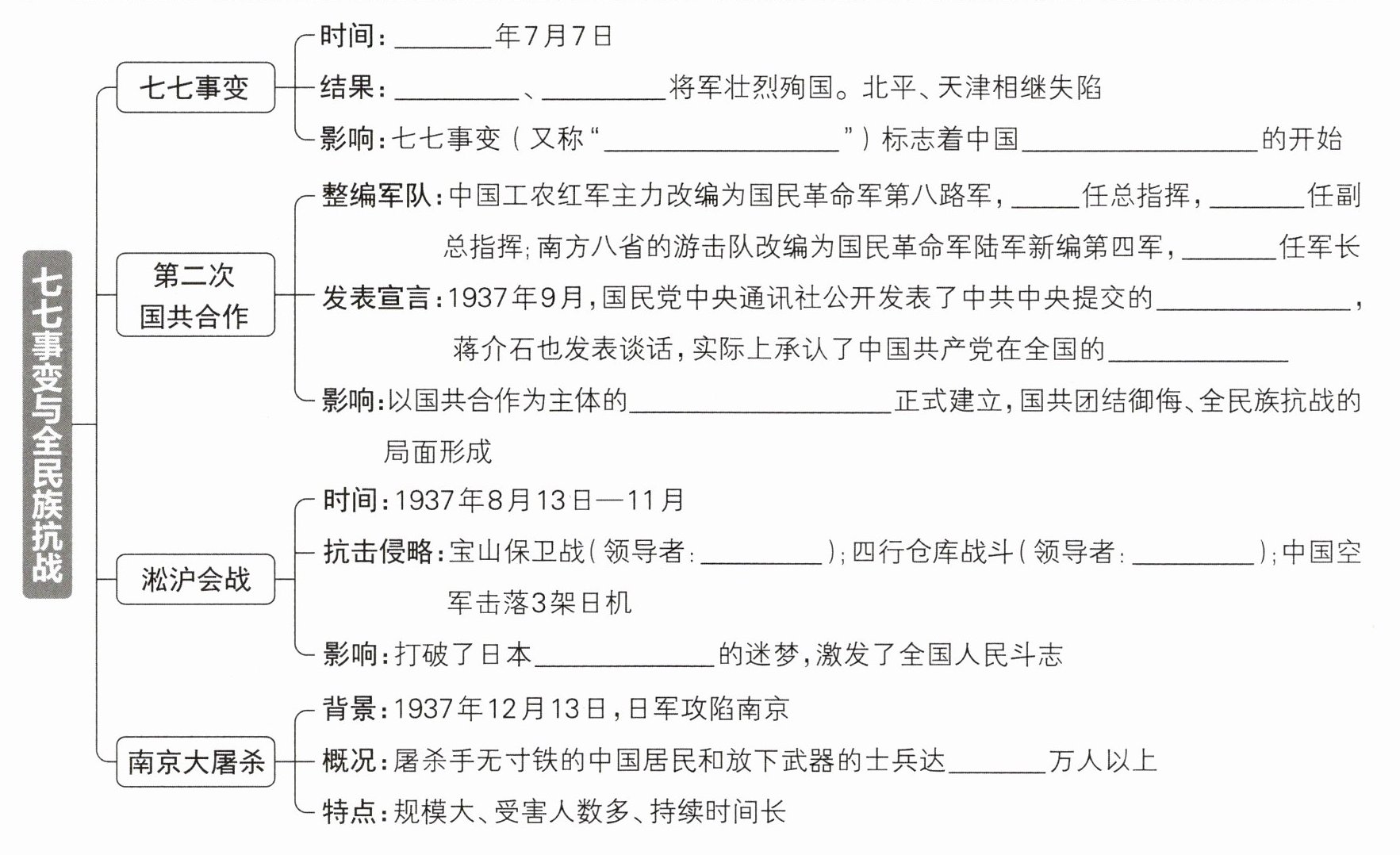 1937 赵登禹 佟麟阁 卢沟桥事变 全民族抗战 朱德 彭德怀 叶挺 国共合作宣言 合法地位 抗日民族统一战线 姚子青 谢晋元 三个月灭亡中国 30