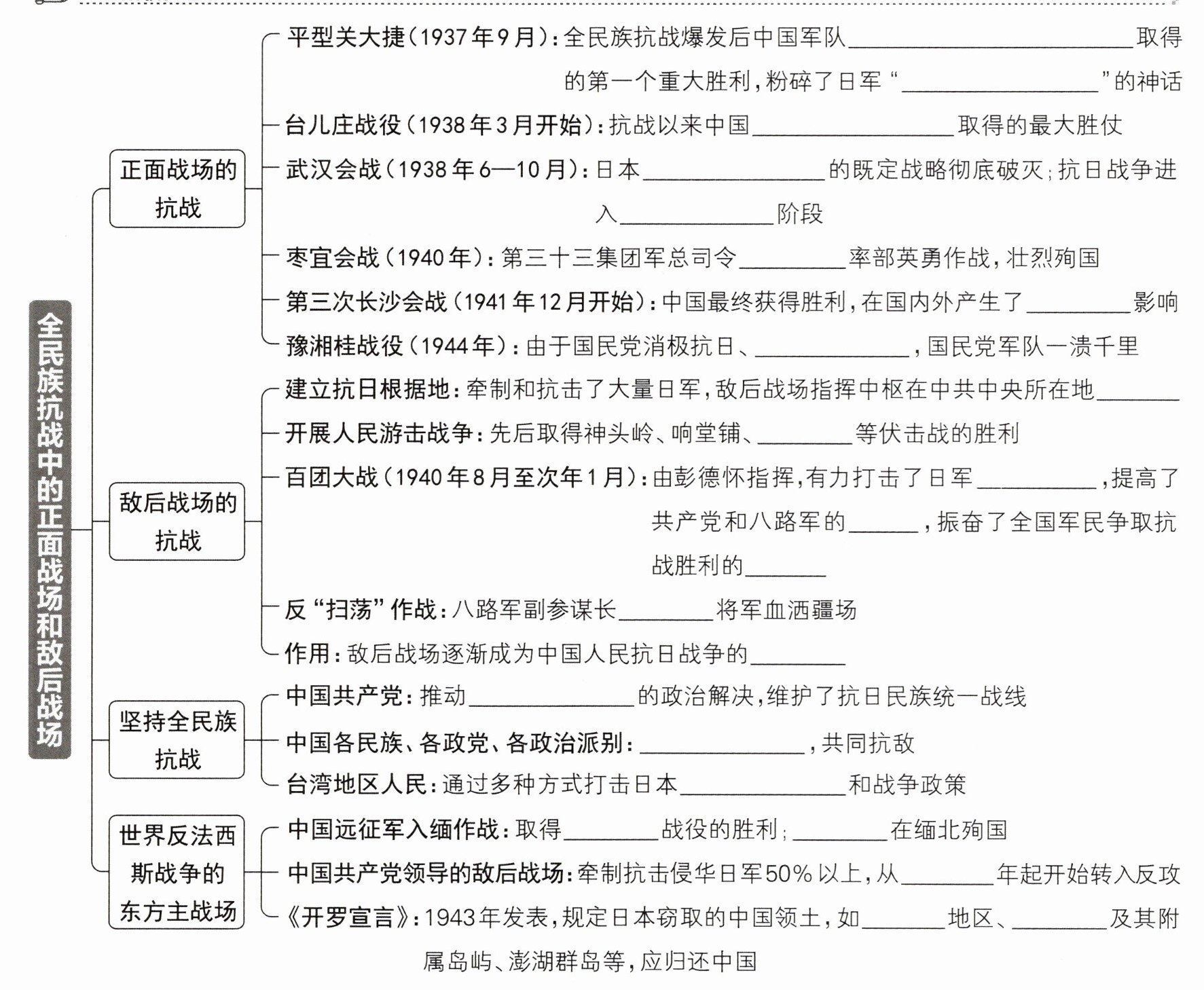 百团大战(1940 年 8 月至次年 1 月):由彭德怀指挥,有力打击了日军侵略气焰,提高了共产党和八路军的威望,振奋了全国军民争取抗战胜利的信心