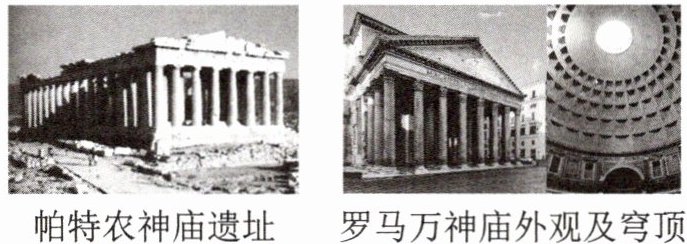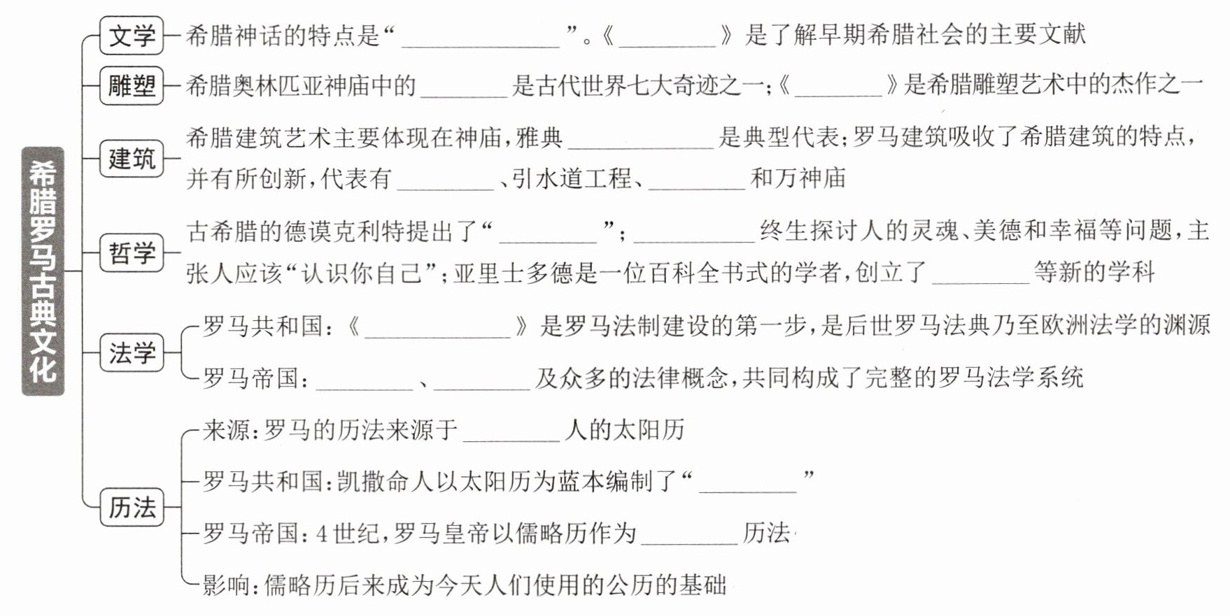 神人同形同性 荷马史诗 宙斯像 掷铁饼者 帕特农神庙 大竞技场 凯旋门 原子论 苏格拉底 逻辑学 十二铜表法 万民法 经济法 古埃及 儒略历 基督教