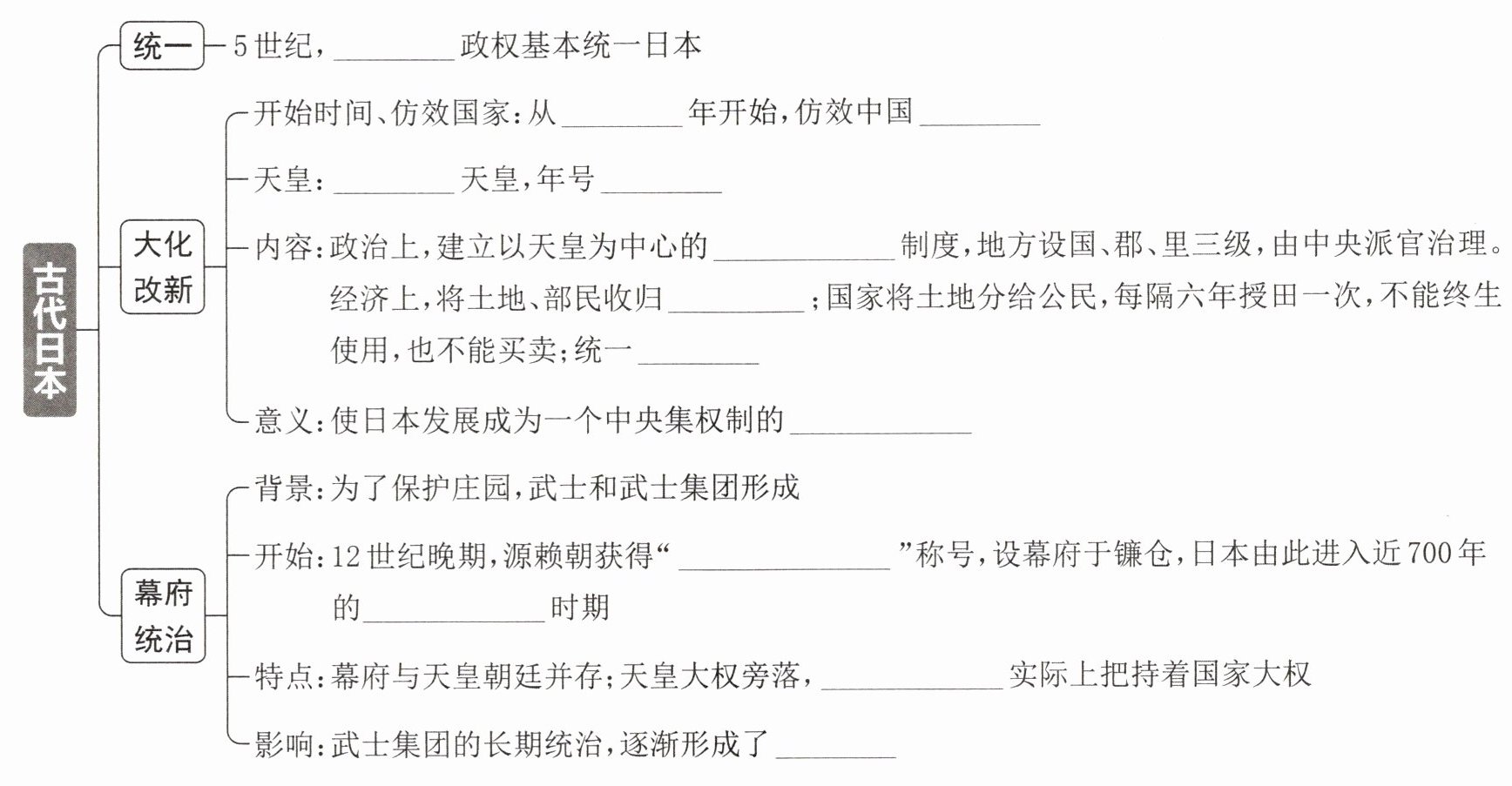 内容:政治上,建立以天皇为中心的中央集权制度,地方设国、郡、里三级,由中央派官治理。经济上,将土地、部民收归国有;国家将土地分给公民,每隔六年授田一次,不能终生使用,也不能买卖;统一赋税