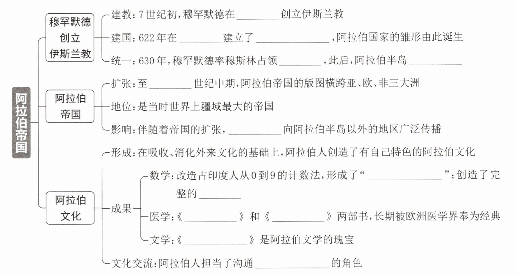 3. (教材P57“相关史事”改编)阿拉伯帝国实行哈里发中央集权统治,哈里发不仅是帝国的最高元首,也是全体穆斯林的宗教领袖。这说明阿拉伯帝国的性质是( )