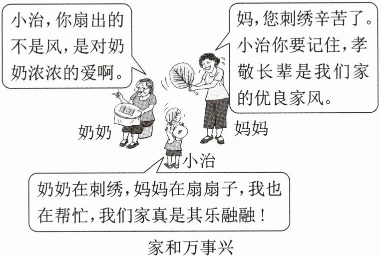 8.(1)①相互理解和包容。漫画中小治和妈妈理解奶奶刺绣辛苦,奶奶理解他们对自己的关爱,家人之间相互理解,让家庭氛围更和谐。②传承优良家风。妈妈教导小治孝敬长辈是优良家风,传承优良家风能增强家庭凝聚力,使家更美好。③主动承担家庭责任。小治、妈妈和奶奶都在为家庭付出,奶奶刺绣,小治和妈妈帮奶奶扇扇子,家庭成员主动承担责任,能让家越来越美好。(2)示例一:我心目中的“美好家庭”是小明一家。理由:小明主动用盆接水浇花,妈妈用淘米水养绿萝,说明小明一家勤俭、节约、环保。他们用心照顾植物,说明这个家庭充满爱心和耐心。 示例二:我心目中的“美好家庭”是小杰一家。理由:小杰主动提醒系安全带,妈妈笑着系好,爸爸设置限速提醒,说明小杰一家是遵纪守法的一家,爸爸妈妈用实际行动给孩子做榜样,让孩子也养成好习惯。选择全家自驾游,说明他们重视家庭集体活动,懂得创造美好回忆。