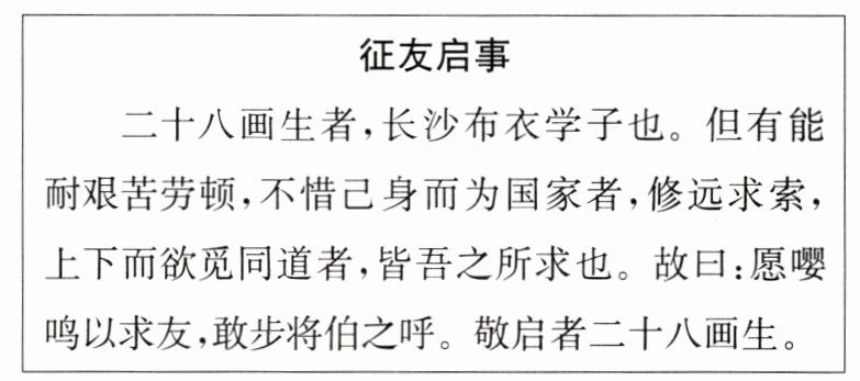 1. 1915年,青年学生毛泽东以“二十八画生”的名义发出一份《征友启事》。