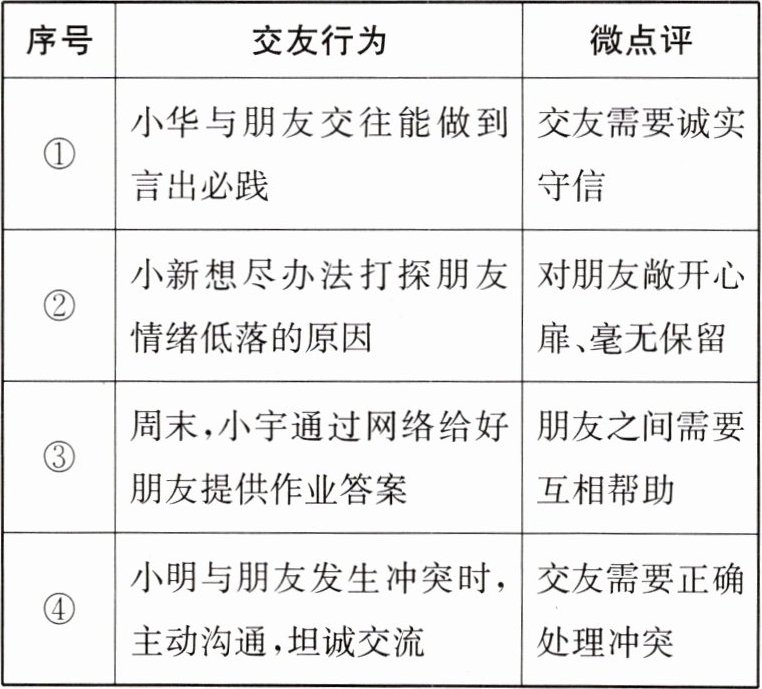 3.B 解析:依据教材知识并分析材料可知,小华与朋友交往能做到言出必践,这说明交友需要诚实守信;小明与朋友发生冲突时,主动沟通,坦诚交流,这说明交友需要正确处理冲突,故①④说法正确。小新想尽办法打探朋友情绪低落的原因的做法错误,我们要尊重朋友的隐私,把握好彼此的界限和分寸,给朋友适当的空间,学会尊重朋友;小宇通过网络给好朋友提供作业答案是错误的行为,因为友谊不能没有原则,我们不能不加分辨地为朋友做任何事,故②③说法错误。