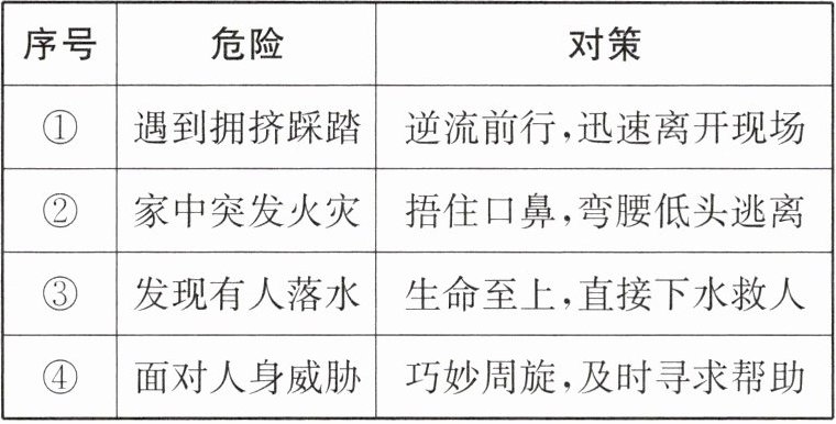 8.(1)示例:止血带。可以应对日常生活中的小磕小碰或进行紧急情况下的初步自救互救。(2)示例:这样的看法是错误的。开展消防疏散演练活动有利于我们提高避险和逃生能力,有利于学习防护的知识和技能,我们应当积极参加。安全与每个人息息相关,我们用心对待和做好事关安全的每一件事,既是对自己的生命安全负责,也是对家庭和社会负责。生命是宝贵的,我们应该敬畏生命、珍爱生命,提升守护生命安全的意识,提高防护能力。(3)示例:②解开患者上衣,撕开电极片,贴在患者胸前 ⑥电击完成后,立刻开始心肺复苏,无须取下电极片