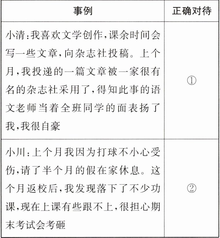 (3)在学习生活中,我们应如何正确对待顺境和逆境?小清和小川分享了以下事例,请你运用所学知识将表格补充完整。