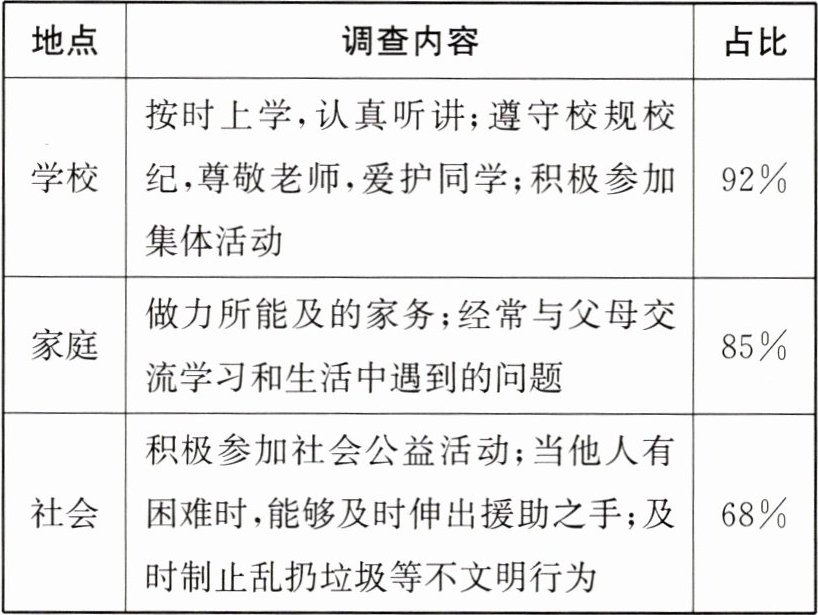 (1)调查结果反映出大部分同学在学校和家庭中能够较好地承担对自己和他人的责任,但在服务和奉献社会方面的表现还有待提高。