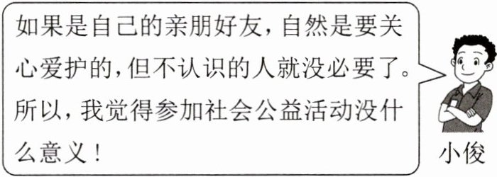 (2)小俊观点错误。 ①我们要对自己负责,首先要对自己的学业成长负责;我们还要对他人、国家和社会负责。 ②参加社会公益活动,是奉献社会的表现,奉献社会能够使我们的视野不断拓展,知识不断丰富,能力不断提高,道德境界不断提升;奉献社会能够推动国家发展、社会进步,推动形成向上向善的强大力量,使我们的社会变得更加和谐美好。