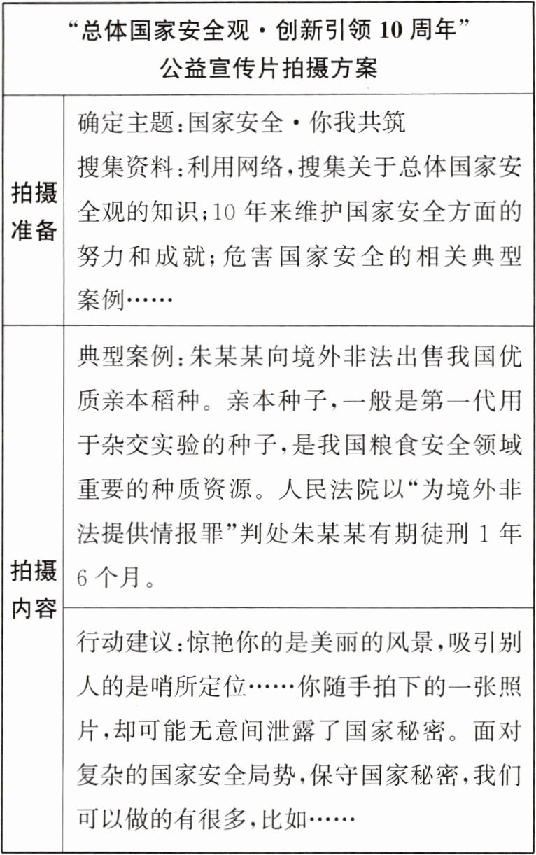 9. (2025·徐州期末)这十年,岁月静好,人间向暖;这十年,坚守不渝,耕耘不辍……2024年是总体国家安全观提出十周年。某校道德与法治学习小组计划拍摄“总体国家安全观·创新引领10周年”公益宣传片。以下是他们的拍摄方案(部分),请你参与。