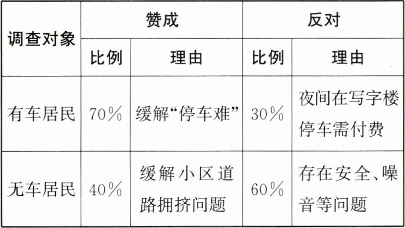 某小区建成于 20 世纪 80 年代,未规划停车位,且无专门物业公司管理。近年来,“停车难”成了小区居民头疼的问题。针对这一问题,居委会积极采取应对措施。第一阶段,应部分居民要求,居委会将小区绿化用地改造为停车位,但遭到另一些居民的强烈反对。第二阶段,居委会计划引入外地的“潮汐式”停车经验,与附近不对外开放停车位的写字楼达成协议:夜间,小区居民可以在写字楼付费停车;白天,写字楼里的上班族可以在小区付费停车,利用“错时停车”共享车位,盘活闲置资源。但这一计划公布后,担忧、质疑也随之出现。本调研小组受居委会邀请,对小区“潮汐式”停车方案展开调查。