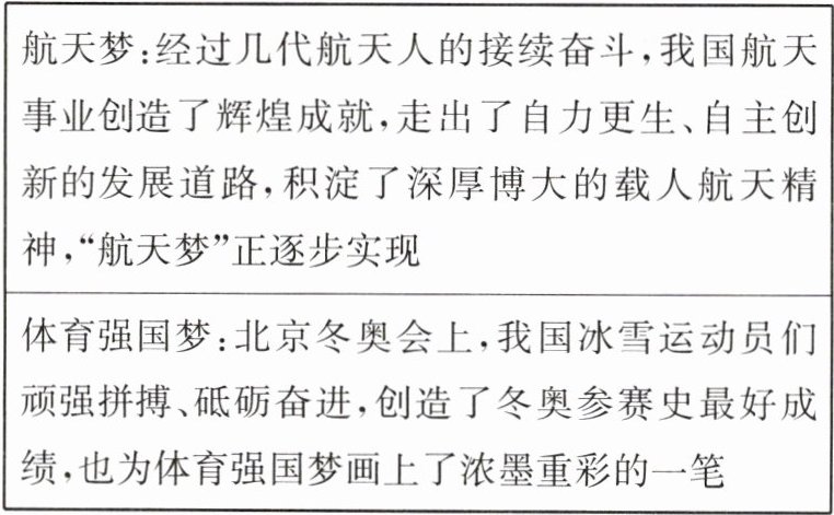 7.(1)经济持续稳定发展;文化建设成效显著,文化自信不断增强;生态环境不断改善(或:高质量发展不断推进);国际地位和国际影响力显著提高。 (2)①物质文明和精神文明相协调的现代化 ②人口规模巨大的现代化 ③全体人民共同富裕的现代化 ④走和平发展道路的现代化 (3)①实现中国梦,就是要实现国家富强、民族振兴、人民幸福。②中国梦是国家的梦、民族的梦,也是每个中国人的梦。③实现伟大梦想,需要我们凝心聚力、坚韧不拔、锲而不舍,奋力开启时代新征程。④中国梦终将在一代代青年的接力奋斗中变为现实。