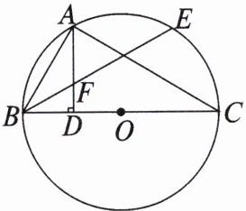 8. 如图,BC是⊙O的直径,A是⊙O上一点,AD⊥BC,垂足为D,BE交AD于点F,且$\overset{\frown}{AB}$ = $\overset{\frown}{AE}$。