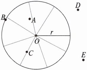 (1) 点$A$,$B$,$C$,$D$,$E$到圆心的距离分别与圆的半径有什么关系?
