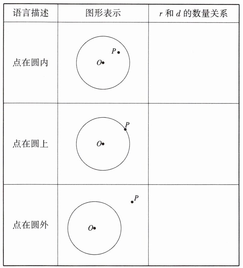 2. 点和圆的3种位置关系所对应的$r$和$d$的数量关系分别是怎样的?请填写下表:
