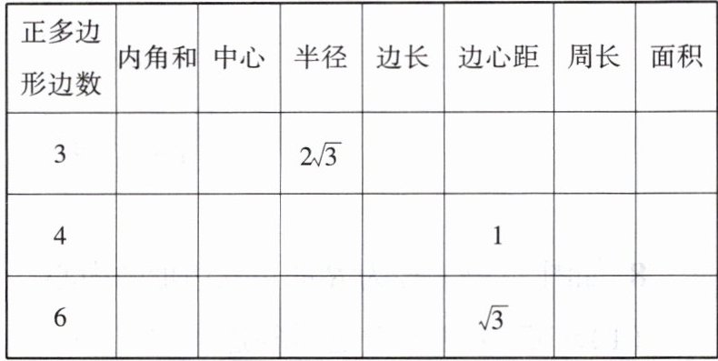 (按照表格内容依次填写)$180^{\circ}$,$120^{\circ}$,6,$\sqrt{3}$,18,$9\sqrt{3}$;$360^{\circ}$,$90^{\circ}$,$\sqrt{2}$,2,8,4;$720^{\circ}$,$60^{\circ}$,2,12,$6\sqrt{3}$