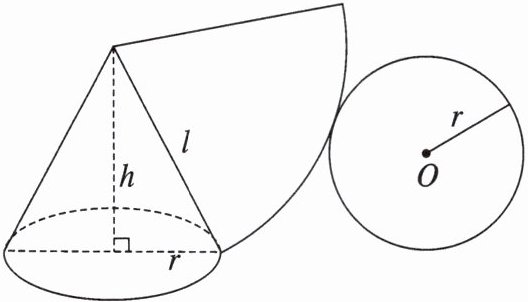 如图,连接圆锥顶点和底面圆上任意点的线段叫作圆锥的母线(图中的线段$ l $),连接顶点和底面圆心的线段叫圆锥的高(图中的$ h $).