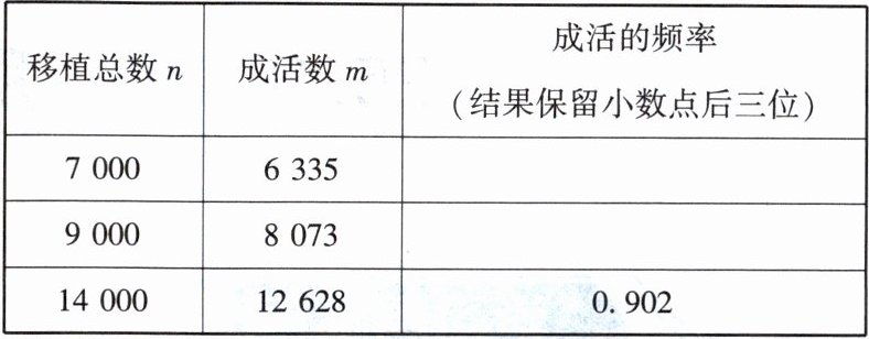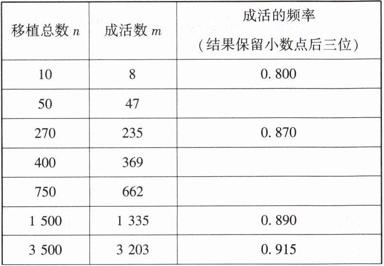 |移植总数$n$|成活数$m$|成活的频率(结果保留小数点后三位)|