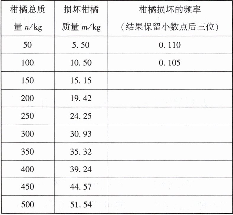 |柑橘总质量n/kg|损坏柑橘质量m/kg|柑橘损坏的频率(结果保留小数点后三位)|