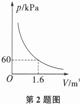 2. 某气球内充满了一定质量的气体,当温度不变时,气球内气体的气压p(kPa)是气体体积V(m³)的反比例函数,其图象如图所示。当气球内的气压大于120kPa时,气球将爆炸。为安全起见,气球的体积应()。