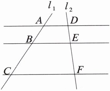 【例2】如图,已知$AD// BE// CF$,它们依次交直线$l_1$,$l_2$于点$A$,$B$,$C$和点$D$,$E$,$F$。如果$AB = 6$,$BC = 8$,$DF = 21$,求$DE$的长度。