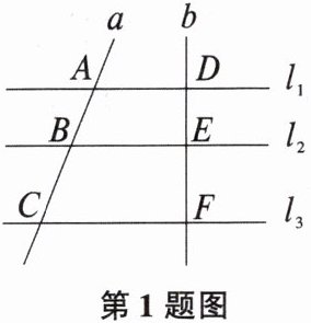 1. 如图,$l_1// l_2// l_3$,直线$a$,$b$与$l_1$,$l_2$,$l_3$分别交于点$A$,$B$,$C$和点$D$,$E$,$F$。若$\frac{AB}{BC}=\frac{2}{3}$,$DE = 4$,则$EF$的长度是()。