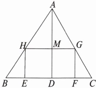 5. 如图,$ \triangle ABC $ 是一张锐角三角形硬纸片,$ AD $ 是 $ BC $ 边上的高,$ BC = 40 \, cm $,$ AD = 30 \, cm $. 从这张硬纸片上剪下一个长 $ HG $ 是宽 $ HE $ 的 2 倍的矩形 $ EFGH $,使它的一边 $ EF $ 在 $ BC $ 上,顶点 $ G $,$ H $ 分别在边 $ AC $,$ AB $ 上,$ AD $ 与 $ HG $ 的交点为 $ M $.