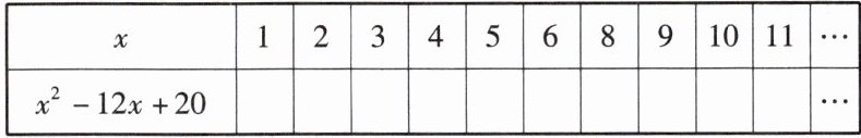 将 $x$ 的值依次代入 $x^{2}-12x + 20$ 计算:当 $x = 1$ 时,$x^{2}-12x + 20=1^{2}-12×1 + 20=1 - 12 + 20 = 9$;当 $x = 2$ 时,$x^{2}-12x + 20=2^{2}-12×2 + 20=4-24 + 20 = 0$;当 $x = 3$ 时,$x^{2}-12x + 20=3^{2}-12×3 + 20=9-36 + 20 = -7$;当 $x = 4$ 时,$x^{2}-12x + 20=4^{2}-12×4 + 20=16-48 + 20 = -12$;当 $x = 5$ 时,$x^{2}-12x + 20=5^{2}-12×5 + 20=25-60 + 20 = -15$;当 $x = 6$ 时,$x^{2}-12x + 20=6^{2}-12×6 + 20=36-72 + 20 = -16$;当 $x = 8$ 时,$x^{2}-12x + 20=8^{2}-12×8 + 20=64-96 + 20 = -12$;当 $x = 9$ 时,$x^{2}-12x + 20=9^{2}-12×9 + 20=81-108 + 20 = -7$;当 $x = 10$ 时,$x^{2}-12x + 20=10^{2}-12×10 + 20=100-120 + 20 = 0$;当 $x = 11$ 时,$x^{2}-12x + 20=11^{2}-12×11 + 20=121-132 + 20 = 9$。填表如下:| $x$ | 1 | 2 | 3 | 4 | 5 | 6 | 8 | 9 | 10 | 11 |$\cdots$|| --- | --- | --- | --- | --- | --- | --- | --- | --- | --- | --- | --- || $x^{2}-12x + 20$ | 9 | 0 | -7 | -12 | -15 | -16 | -12 | -7 | 0 | 9 |$\cdots$|